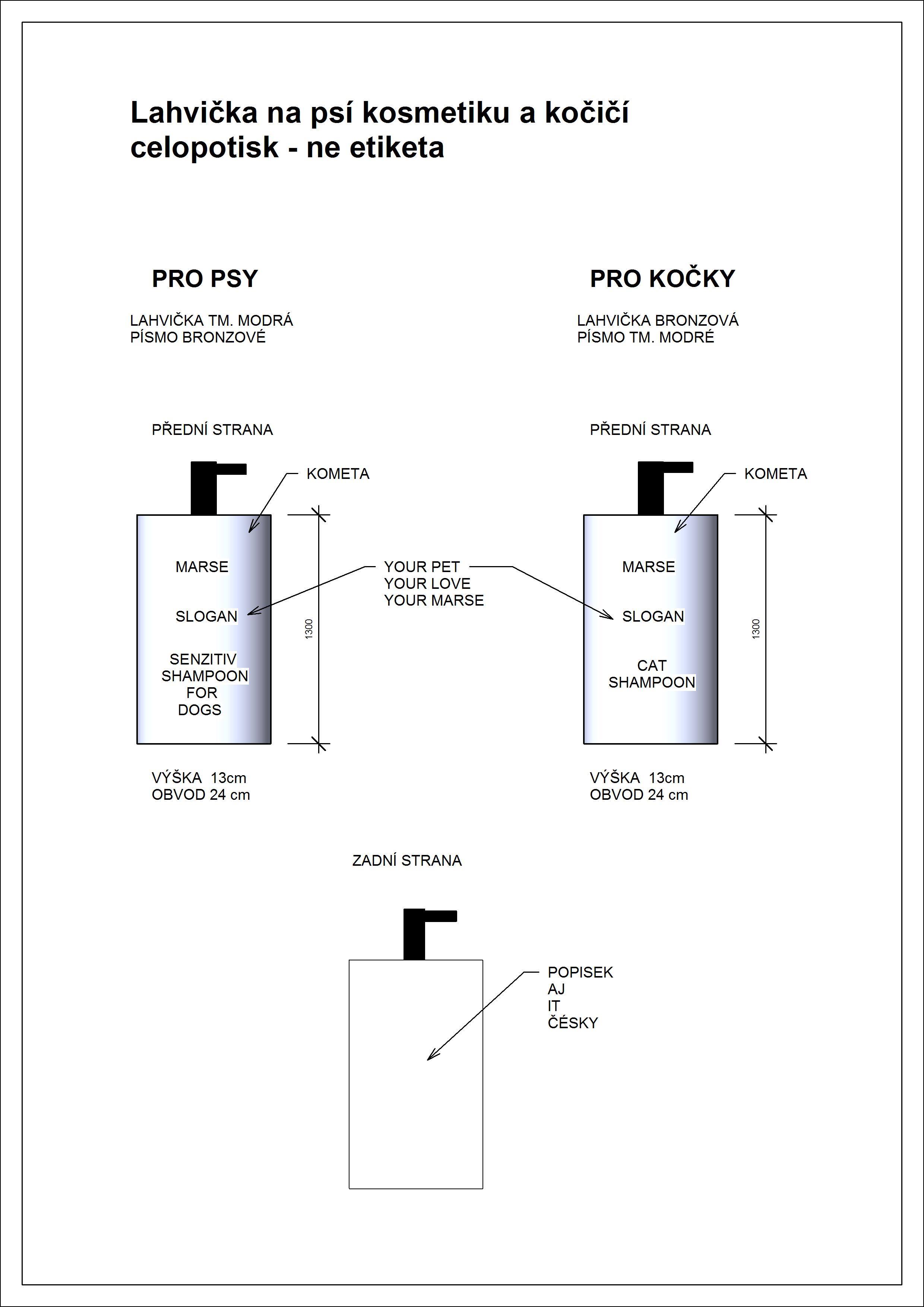 V příloze zasíláme lahvičku 500ml, která bude následně potažena tmavěmodrou pogumovanou barvou. Tato barva se nemůže měnit ( číslo barvy v příloze ). Všechny nápisy na lahvičce musí být v barvě bronzové ( číslo barvy v příloze). Přikládáme náčrtek, ale může se vyzkoušet jiná kombinace rozložení textu. Co je pro nás důležité