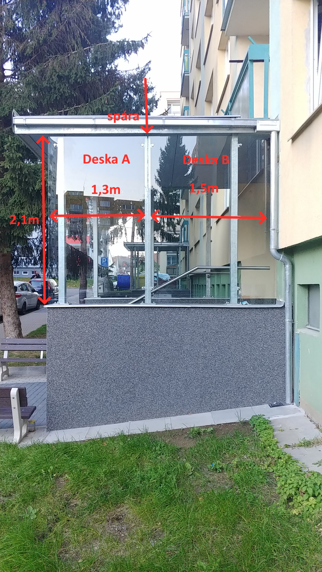 Skla jsou součástí zakrytí (ochrana proti dešti, sněhu, větru apod.) dvou vstupů do panelových domů.